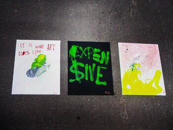 « Il mio stile varia dall'astratto al moderno, dalla pop art, all'autoproduzione ai ritratti con un occhio solo. Il mio lavoro contiene tonnellate di sarcasmo e la voglia di provocare lo spettatore e attirare la loro attenzione. »