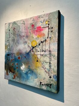 Questa serie è iniziata con una scoperta: degli strofinacci da cucina che avevo lasciato nella mia attuale casa. Le loro origini e le loro storie mi erano sconosciute, ma ben presto divennero strumenti indispensabili nel mio studio: come stracci per dipingere. Per mesi hanno assorbito la vernice in eccesso, pulito i miei pennelli e sorpreso gli incidenti mentre lavoravo ad altri pezzi. Quasi inosservati e gettati via di nuovo, si sono trasformati… in bellissime tele, che ho poi utilizzato come superficie pittorica per queste opere. Arricchite con segni mirati le mie composizioni casuali, le ho trasformate in opere d'arte finite, collegando così la loro precedente utilità alla loro nuova identità. Ogni opera sembra un dialogo tra passato e presente, tra casualità e intenzione, e mi ricorda il potere della trasformazione e la bellezza nascosta in ciò che viene trascurato.