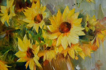 Questa opera d'arte affascina con la sua vivace esposizione di girasoli, che trasuda calore e vitalità. I girasoli dominano la composizione, i loro vivaci petali gialli contrastano in modo sorprendente con uno sfondo tenue. Una delicata teiera di porcellana e la brocca abbinata sono appoggiate elegantemente su un tavolo di legno, le loro superfici lisce riflettono una luce soffusa e ambientale. Un sottile gioco di luci e ombre aggiunge profondità,… arricchendo la scena con un senso di realismo. Uva e una mela verde aggiungono un tocco di colore e consistenza, evocando un'abbondante atmosfera di raccolto. Le pennellate dinamiche del pittore si fondono perfettamente, creando un equilibrio armonioso tra i girasoli audaci e la delicata eleganza del set di ceramiche. Questo pezzo combina magistralmente la natura morta con le tecniche impressionistiche, invitando l'osservatore ad apprezzare la bellezza degli oggetti di uso quotidiano e la natura fugace della vita.