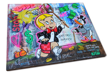 In questa opera d'arte pop dinamica e accattivante, troviamo gli iconici Richie Rich e Paperone immersi in un colorato vortice di valuta, che incarna lo spirito di ambizione e successo. L'opera d'arte cattura un momento di euforia mentre Richie Rich coglie con entusiasmo le opportunità di ricchezza. Scarabocchi, citazioni e ritagli di collage, simboli del dollaro e altri simboli di successo turbinano attorno a Richie Rich, creando un senso di movimento… ed energia. Questo pezzo unico cattura l'essenza di due personaggi che incarnano il sogno americano del successo imprenditoriale.