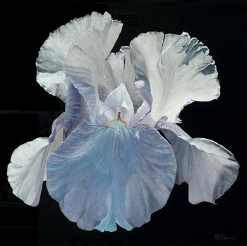 Questa iride proviene da un incrocio naturale tra due iris germaniche dal suo giardino. Lui è unico. Voleva mostrare tutta la bellezza di questo fiore alla luce del sole che brillava come un gioiello. Per ottenere il massimo… dei dettagli, ha scelto di realizzarlo su una lastra di alluminio che porta anche la sua parte di eleganza alla realizzazione.