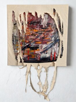 Leigh Sausville lavora principalmente con olio, cera e materiali tessili, attingendo alla sua vasta esperienza in belle arti, design e amministrazione artistica. La sua tecnica astratta si concentra sulla stratificazione tattile, sulla raschiatura, sullo strappo e sulla velatura, creando superfici che riflettono fragilità e resilienza e invitando l'imprevedibilità dei materiali come parte del suo processo. I suoi dipinti evocativi trasmettono la crudezza della memoria, del dolore e delle emozioni incarnate, offrendo agli spettatori un paesaggio sensoriale in cui i mondi interiori – disordinati, vulnerabili e tuttavia luminosi – vengono osservati e custoditi con tenerezza.