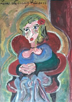 In questa opera, Len Vernaghi esplora la complessità delle emozioni umane attraverso l'uso di colori vivaci e forme espressive tipiche del cubismo e dell'espressionismo. La figura ritratta, ovverosia una donna immersa in pensieri profondi, è avvolta da tonalità che parlano di introspezione e mistero. Con ogni pennellata, l'artista cattura e intrappola nel suo dipinto l'essenza della riflessione interiore, invitando lo spettatore a contemplare la… propria interiorità. Questo pezzo infonderà energia e profondità emotiva in ogni spazio, arricchendolo di nuove prospettive. L'opera è ispirata al cubismo, in particolare alle opere d'arte di Picasso.