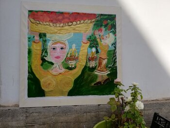 Nel mio dipinto ho voluto catturare la vitalità e la gioia della natura, usando acrilici, olio e tecniche di collage. La figura centrale rappresenta l'abbondanza e la generosità della terra, simboleggiata dalla raccolta delle arance. Il suo sguardo diretto e la ricchezza dei colori trasmettono forza e serenità, portando un'energia vivace e ispiratrice in ogni ambiente. Quest'opera d'arte è stata realizzata con olio e acrilici su carta; la carta è… stata poi incollata su tela. L'opera è pronta da appendere, per via di un gancio montato dall'artista sul telaio in legno della tela, ma non è incorniciata.