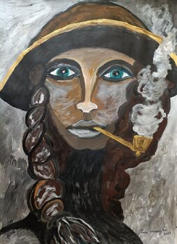 In questa mia opera l'artista ha unito l'influenza dell'arte aborigena con il simbolismo e il figurativo, sfruttando l'acrilico su carta per esprimere profondità emozionale e intrinseco mistero. I colori terrestri e gli sguardi penetranti della ragazza rivelano una storia non detta, una resistenza silente. Con i suoi occhi vividi e l'atto di fumare contemplativo, l'artista invita lo spettatore in un dialogo intimo ma universale sulle sfide e la resilienza… umana. La pipa, oggetto solitamente associato all'uomo, è qui simbolo di sensualità e sogno; quest'opera d'arte presenta un elemento di emancipazione femminile.