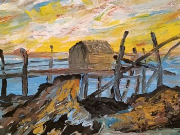 Il soggetto del quadro, dipinto su tela con acrilico nel 2023, è un'antica macchina da pesca tipica delle coste abruzzesi, garganiche e molisane, tutelata come patrimonio monumentale nella costa dei Trabocchi (in Abruzzo). La più antica data di esistenza documentata risale al XVIII secolo, periodo in cui i pescatori dell'Abruzzo dovettero ingegnarsi per ideare una tecnica di pesca che non fosse soggetta alle condizioni meteomarine della zona. I trabucchi,… infatti, permettono di pescare senza doversi inoltrare per mare: sfruttando la morfologia rocciosa di alcune zone pescose della costa, venivano costruiti nel punto più prominente di punte e promontori, gettando le reti verso il largo attraverso un sistema di monumentali bracci lignei. L'uso vigoroso dell'acrilico, in stile espressionista e naif, illustra un trabocco abruzzese, simbolo di resilienza e stabilità a fronte delle mutevoli maree della vita.
