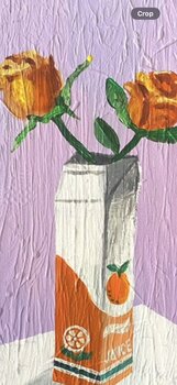 "Breakfast Romance" è una natura morta contemporanea che infonde un significato poetico alla quotidianità. Un semplice cartone di succo di frutta diventa un vaso, e due fiori aggiungono un tocco caldo e vibrante.