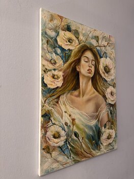 In quest'opera, ho riversato tutta la mia anima nel catturare la serena armonia tra la bellezza umana e il delicato abbraccio della natura. Utilizzando acrilico e olio, ho unito morbidezza e texture audaci per esprimere un mondo sognante e semi-astratto in cui coesistono calma e vitalità. Questo dipinto porterà una ventata di aria fresca e un senso di sereno risveglio in qualsiasi spazio, evocando emozioni di rinnovamento e forza silenziosa.