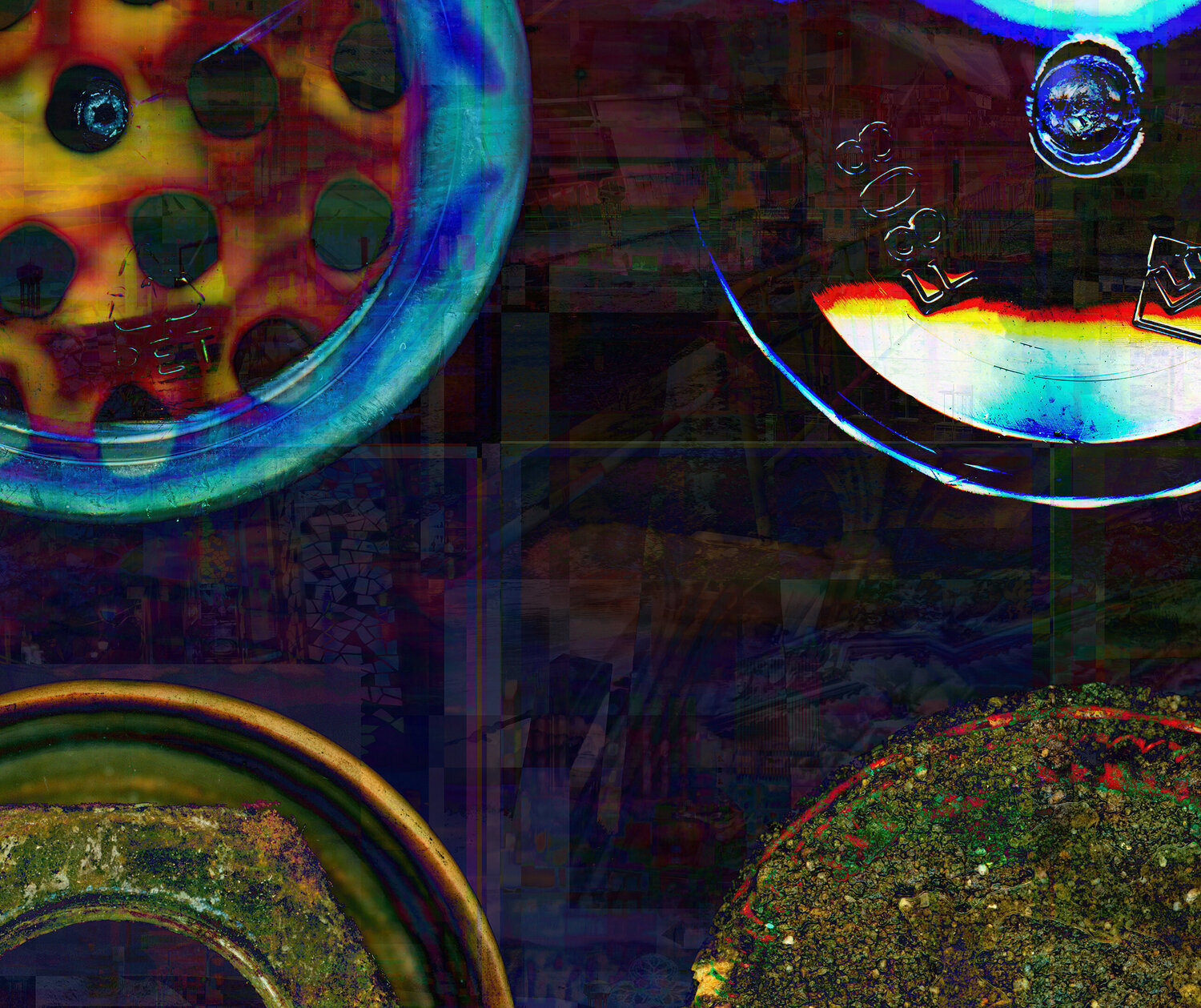 di testi, texture e oggetti vari che, una volta digitalizzati, perdono la loro identità quando vengono combinati e manipolati digitalmente.