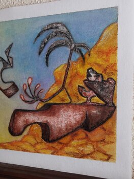 A destra, ho suggerito una palma o un altro albero in movimento, appollaiato su una formazione rocciosa sospesa, dalla forma quasi simile a un coltello fluttuante. Mi piace pensare a questi elementi come entità che sfidano la gravità e mettono in discussione il concetto di permanenza.