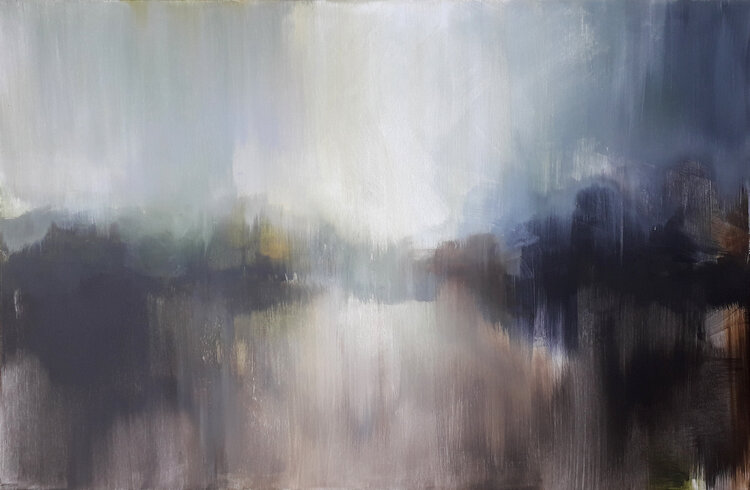 Per esprimere l'idea di un confine tra due mondi, ho scelto una tela panoramica vicina al formato marino. L'acrilico composto da Mars Black, White, Payne Grey e Hooker Green mi ha permesso di applicare velocemente i lavaggi 00 e le velature necessarie per la trasparenza dei colori. Come al solito ho scelto una luce diffusa che sembra provenire da gran parte del paesaggio, continuando a privilegiare una fonte di luce centrale. Mi piace lasciare… che lo spettatore, perché alla fine può essere uno spettacolo, immagini cosa potrebbe nascondersi dietro le sagome all'orizzonte, quale presenza, quale forma di vita potrebbe emergerne. C'è lì come un'attesa che non dice il suo nome, è implicita e forse inconscia ma necessariamente contemplativa o addirittura interrogativa.