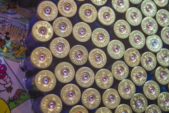 Un pezzo unico. Scultura di bossoli di fucile su resina e legno con motivi tratti dai fumetti. "Il modo migliore per usare i proiettili". I bossoli luminosi formano una silhouette in contrasto con le pagine dei fumetti vintage: una potente dichiarazione di identità e commercio. Porta energia e un'atmosfera provocatoria in qualsiasi ambiente, ispirando riflessione e meraviglia.