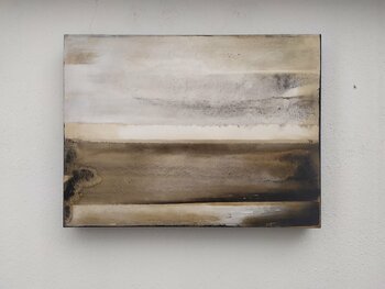 Questa serie di dipinti, simili per colori e tecnica, gioca sulla linea di orizzonte che divide cielo e terra. Sono immagini, squarci di luce e ombre, visioni. La tela è in puro cotone, con imprimitura realizzata a mano.