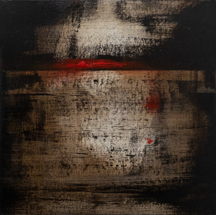 Questa serie di dipinti, simili per colori e tecnica, gioca sulla linea di orizzonte che divide cielo e terra. Sono tramonti immaginari, squarci di luce e ombre, visioni, apparizioni. In questa opera, lungo la linea di orizzonte, tra mare e terra, si materializza l'ombra della sera. Il dipinto, pronto per essere appeso, verrà spedito con cura.