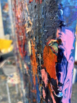 Pennellate caotiche ma ritmate evocano una danza tra la notte e l'alba, in cui… le emozioni si scontrano e si fondono.