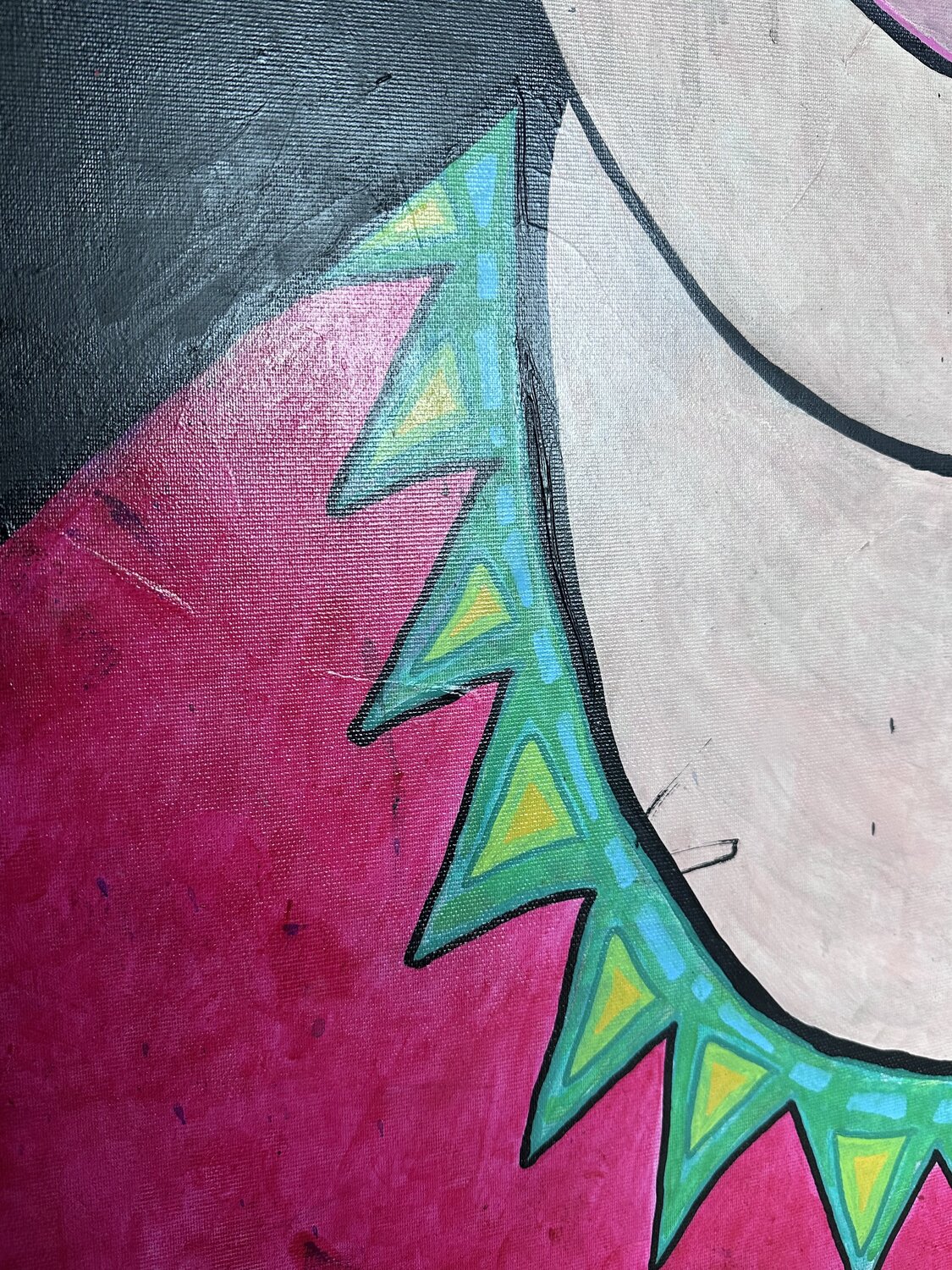 Un'altra donna del pittore milanese, una grande tela con cornice in legno, trattata con gesso acrilico. I colori scelti sono appositamente studiati per un approccio cromatico delicato e morbido. Pur essendo pop art, quest'opera si adatta facilmente a una varietà di interni, proprio per questa sua unicità. Questa tela è carica di emozioni, con rilievi, schizzi e colature di colore, offrendo un approccio sensoriale e materico davvero unico, è difficile… osservarla da vicino senza commuoversi.