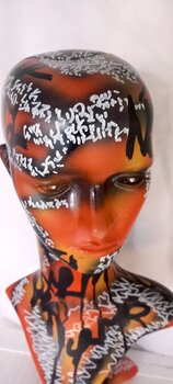 Questa scultura è un'esplosione di energia e opposizione. Ho usato acrilico su plastica per creare un busto che trasmette forza e vulnerabilità insieme, con scritte e segni che parlano di lotta e resilienza. Volevo che chi la osserva sentisse… il pulsare di un'anima intensa, capace di resistere e trasformarsi. Porterà una vibrazione intensa e contemporanea in qualsiasi ambiente.