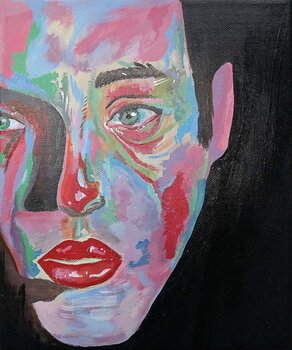 La superficie del viso è dipinta con colori intensi e vivaci: rosso, verde, azzurro, rosa, lilla, e tocchi di giallo e nero si… sovrappongono in campiture irregolari, che frammentano la fisionomia e donano all'opera un senso di movimento emotivo e psicologico. Gli occhi verdi, punto focale del quadro, emergono tra queste pennellate cromatiche con uno sguardo vivido e diretto, quasi malinconico, accentuato da contorni rossi che ne enfatizzano l’espressività.