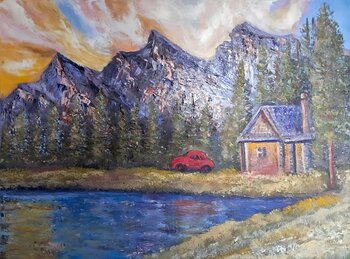 La casetta di montagna è un dipinto a olio su tela, 50x70 cm, realizzato in stile impressionista, che cattura l'incanto di una tranquilla scena alpina.