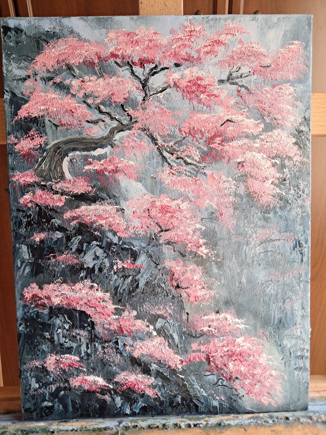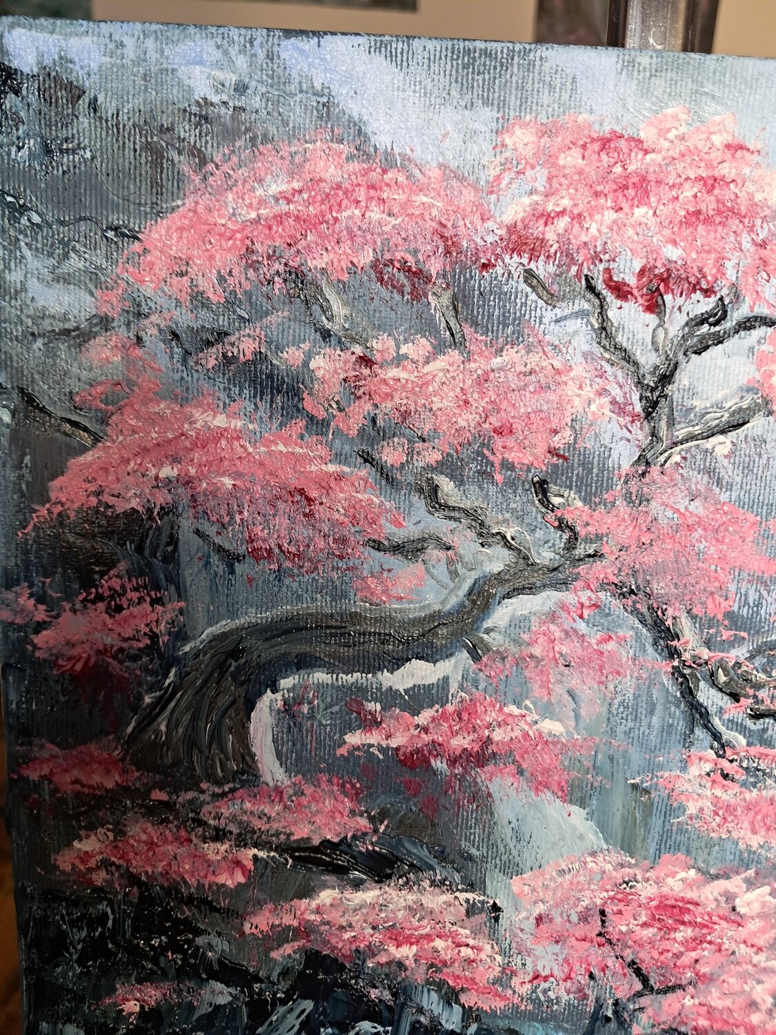 "Con quest'opera ho voluto catturare l'istante preciso in cui la vita esplode con una forza inarrestabile, anche dove sembra impossibile. Ho scelto di dipingere questi ciliegi in fiore che si arrampicano su una parete rocciosa scura per esplorare il contrasto tra la delicatezza effimera dei petali e la durezza millenaria della pietra.