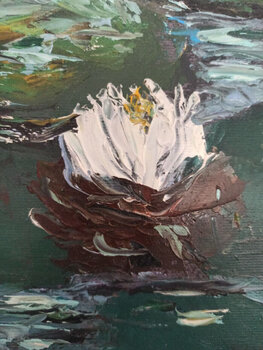 Al centro del quadro, la ninfea si apre con delicatezza, rivelando petali immacolati che sembrano brillare sotto il sole. La sua riflessione sull'acqua crea una sensazione di profondità e mistero.… Il verde intenso del fogliame circostante avvolge la ninfea, creando un contrasto cromatico che esalta la sua bellezza.