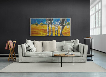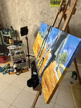 Il mio nuovo dipinto è nel colore della bandiera ucraina, ma le figure umane sono in bianco e nero. Con questo ho voluto… enfatizzare una sorta di effetto documentaristico, come se fosse una fotografia casuale, ho cercato di sottolineare quanto sia fragile e molto fragile il concetto di “vita”. Un minuto abbiamo visto una famiglia felice, e poi è morta, cancellata dalla memoria della terra, sparpagliata in migliaia di frammenti invisibili. Ma c'è un'altra versione che spiega questa immagine. Forse questa famiglia era salva e già molto lontana dalla guerra. Ogni spettatore può speculare sullo sviluppo degli eventi.