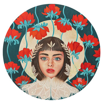 In questa opera, ho realizzato il ritratto immaginario di una ragazza di un´ epoca lontana, probabilmente una cacciatrice, immortalata nella contemplazione della bellezza della natura. Circondata da una caduta e insieme un´ ascesa di fiori rossi. Questi, vibranti e vivaci, simboleggiano la passione e la forza interiore, collocandola in una cornice di forma circolare che amplifica l´´ armonia e l'unità tra l'umano e il naturale.