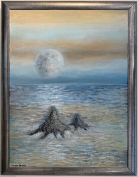 In questo dipinto acrilico vintage, ho catturato il sereno abbraccio del chiaro di luna su acque tranquille. La luna splendente aleggia dolcemente, proiettando un bagliore mistico che invita alla quieta riflessione. Volevo evocare sensazioni di pace e di connessione senza tempo, trasportando gli spettatori in un momento di calma e meraviglia. Quest'opera trasmette un'energia rilassante e contemplativa che creerà un'atmosfera armoniosa e onirica in… qualsiasi ambiente.