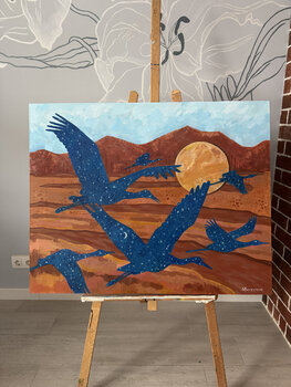 Il dipinto raffigura un paesaggio astratto in terracotta, un sole dorato brillante e uno stormo di gru blu che si muovono tra i mondi. Il paesaggio surreale fa riflettere sullo scopo dell'anima, sull'esperienza che riceve durante la sua permanenza fuori dal corpo terreno. I saggi dicono che abbiamo le risposte a tutte le domande da soli, dobbiamo solo fidarci di noi stessi e scartare tutto ciò che è inutile, superficiale. L'anima riceve queste risposte…