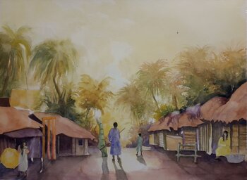 Questo acquerello evoca un momento sospeso in un villaggio africano immerso nella luce dorata del mattino. Le snelle sagome degli abitanti, vestiti con tuniche colorate, si stagliano contro la terra ocra, mentre le palme sembrano ardere ai primi raggi del sole. Le tradizionali capanne con il tetto di paglia creano un ritmo visivo che guida l'occhio verso lo sfondo luminoso della composizione. La delicata tavolozza di tonalità gialle, malva e verdi… riflette la dolcezza di quest'ora di transizione in cui la vita del villaggio si risveglia gradualmente. Quest'opera testimonia il mio approccio sensibile al viaggio, dove la tecnica dell'acquerello mi consente di catturare non solo l'essenza visiva dei luoghi, ma anche la loro atmosfera emotiva e la quieta dignità dei loro abitanti.