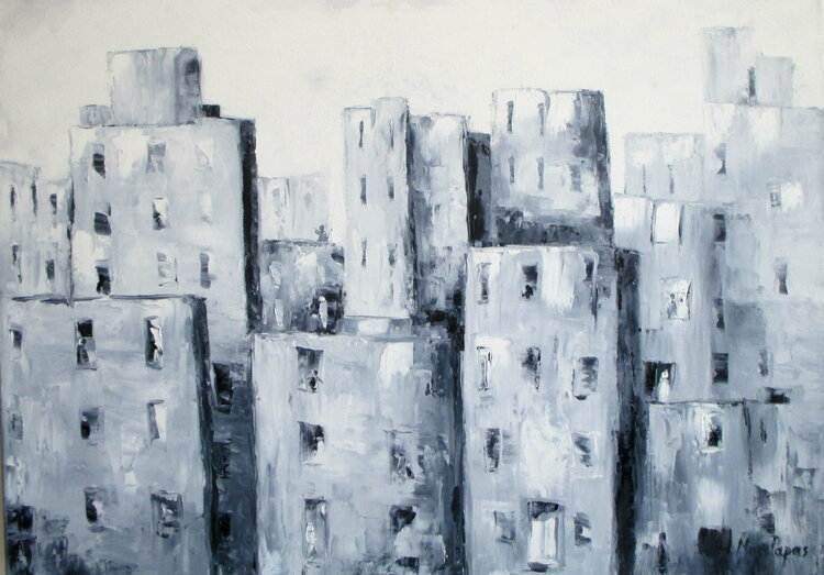 Questo dipinto è stato ispirato dal modo in cui stiamo vivendo quest'anno, le persone trascorrono più tempo a casa cercando di evitare di avvicinarsi alla frenetica popolazione urbana. Spatola e colori ad olio spessi sono usati per un'opera d'arte molto strutturata.