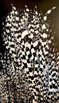 In quest'opera, ho riversato energia pura e movimento in forme vorticose in bianco e nero, come uno sciame animato da un movimento incessante. Utilizzando colori acrilici, ho voluto evocare un ritmo futuristico ma surreale, una tensione tra caos e ordine.