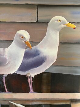 In questo dipinto a olio, ho catturato l'essenza composta ma stravagante dei gabbiani allineati lungo un molo esposto alle intemperie. Ogni uccello, singolarmente espressivo, sembra raccontare la propria storia, dando vita ai dialoghi silenziosi e non così silenziosi che si svolgono sul bordo dell'acqua. Questa opera d'arte riflette i momenti sereni della vita, sottilmente miscelati con un tocco di umorismo, perfetti per aggiungere un'energia calma… ma vivace a qualsiasi spazio abitativo.