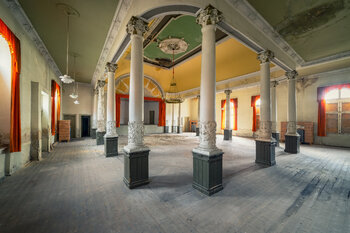 Questa foto mostra la sala dei banchetti di una locanda abbandonata. In passato qui si celebravano delle feste. Ma oggi la sala cade sempre più in rovina. Presto non ci sarà più nulla da vedere di questa grande sala.