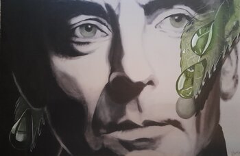 Questa immagine mostra il Maestro mentre interagisce con l'elemento natura. Le foglie e le gocce dipinte alludono all'eterno ciclo della vita, a ciò che passa ma che al tempo stesso nutre. Lo sguardo severo, quasi iconico, di Karajan è delicatamente circondato da forme vegetali che lo proteggono e al tempo stesso lo commentano. Non volevo romperne l'aura, ma piuttosto approfondirla con un simbolismo silenzioso.