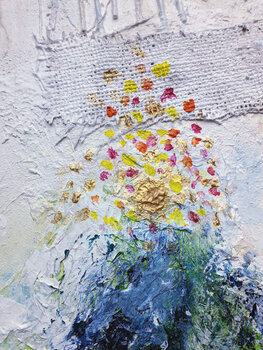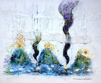 Ho creato quest'opera per esprimere la tensione, l'orrore e la speranza intrecciati attraverso il simbolismo delle montagne di gioia alla fine della pandemia di COVID, e delle valli di tristezza e del fumo delle cremazioni. Utilizzando colori acrilici, collage di bastoncini di cotone, mascherine di stoffa e sabbia, l'ho infusa di un'energia grezza e tattile. Ogni dettaglio evoca forza interiore e trasformazione, infondendo una dinamica vibrante e… profonda nel vostro spazio, un soffio di intensa emozione e riflessione.