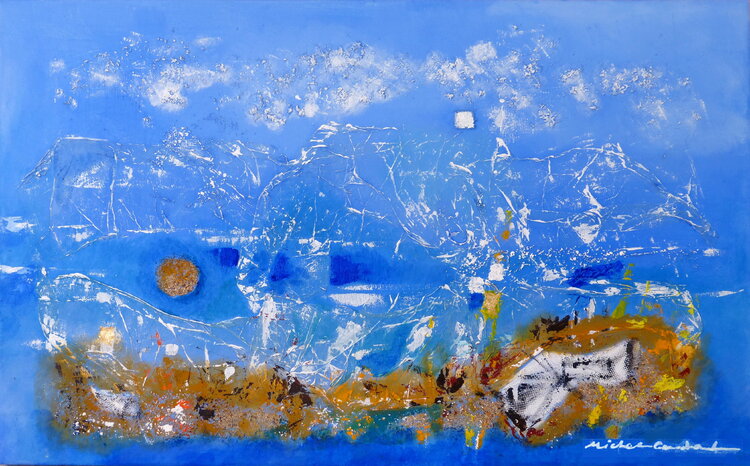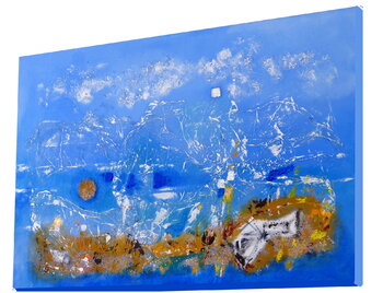 In quest'opera, ispirata alla poesia di Rimbaud "Le Bateau ivre" (La barca ubriaca), "dove improvvisamente il blu si tinge", ho voluto catturare l'essenza mutevole del mare e del cielo, fondendo texture sabbiose e pittura acrilica per creare una profondità tattile. Forme astratte emergono come ricordi confusi, evocando tranquillità e mistero. Porterà un'atmosfera rilassante nella vostra casa, vibrante di emozioni profonde e luce infinita.