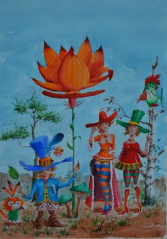 In questo lavoro ho utilizzato la tempera per catturare una scena surreale, piena di colori vivaci e personaggi incantevoli. Ogni elemento, dai cappelli eccentrici ai fiori giganti, è intriso di gioia e giocosità, invitando lo spettatore in un mondo dove l'immaginazione regna senza limiti. Questo pezzo aggiungerà energia vibrante e un affascinante senso di mistero a qualsiasi casa, evocando sorrisi e curiosità in tutti coloro che lo vedono.