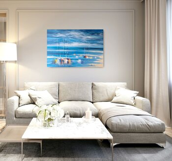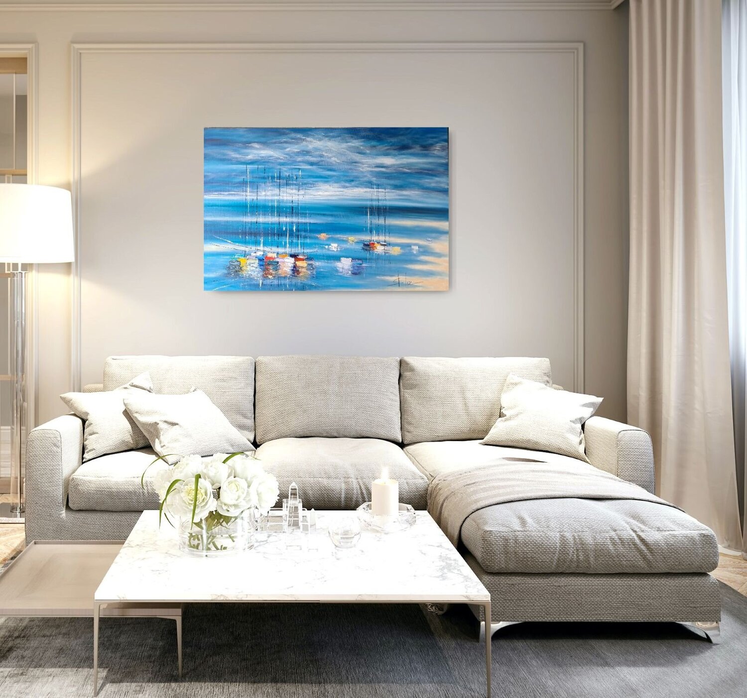Week-End en Liberté 5 è un paesaggio marino semi-astratto, della serie Un Monde en Bleu, dipinto a olio, con pennello e coltello, con impasto sul motivo e ricoperto da una vernice satinata. Come in ogni mia composizione, la mia idea è quella di suggerire, di alleggerire il motivo per non racchiudere lo sguardo e lasciare spazio allo spazio e alla sensazione di libertà che lo spettatore ha guardando la tela.