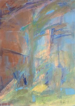 Il colore arriva qui come il tempo atmosferico. Veli di acquamarina, celadon e lavanda fluttuano sul caldo bronzo metallico, come se l'aria fresca si muovesse attraverso il calore pomeridiano. Una spina verticale di luce si erge vicino al centro, circondata da ampie pennellate simili al vento. Sebbene astratto, il dipinto allude al paesaggio: rami, luce, orizzonte. Strati di smalto traslucido e colore sfumato creano bordi mutevoli dove la forma si… dissolve nell'atmosfera. Silenzioso ma dinamico, diventa una meditazione sulla percezione e su come la luce trovi la sua strada attraverso il tempo e la pittura.