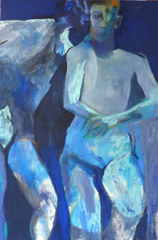 In quest'opera, ho esplorato le profondità della connessione umana utilizzando intense tonalità di blu e forme espressive. Le figure si uniscono in un momento di desiderio e vulnerabilità, catturate in un'atmosfera onirica. L'opera riempie lo spazio di una potenza emotiva che è al tempo stesso calmante e commovente, permettendo all'osservatore di percepire la connessione tra corpo e anima.