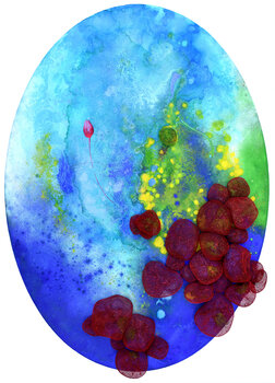 Sotto la superficie apparentemente tranquilla, correnti segrete custodiscono i semi di ogni rinascita. Quest'opera originale a tecnica mista, "Ferite Sottomarine Germinano", vi invita in un paesaggio interiore dove la fluidità dell'acqua incontra la densità della materia. Lo sfondo, un soffio di blu, verde e bianco, si muove come onde lente, evocando libertà e introspezione. Sul fondo, aggrappato a una parete, un nucleo rosso formato da rifiuti umani… depositati sul fondale marino (un conglomerato di reti di plastica) si trasforma in un elemento organico tridimensionale, un rifugio per i pesci, un nido per i molluschi, una radice che genera vita.