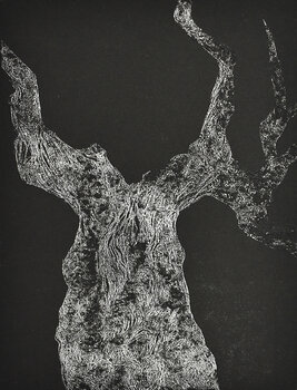 Questa sorprendente acquaforte, "Verso l'alto nero", è un'opera accattivante della collezione "Radici". Stampata sapientemente in due intense tonalità di nero su carta Magnani bianca pesante da 300 g/m², quest'opera d'arte di medie dimensioni mette in mostra la bellezza selvaggia della natura. La mano esperta dell'artista ha trasformato la lastra di zinco, dando vita a una stampa che trasmette un senso di profonda radicamento e di aspirazione.