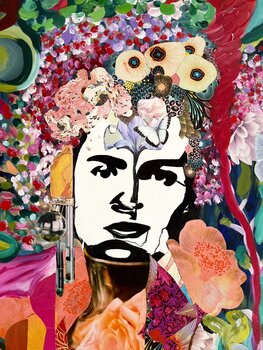 Frida Kahlo è rappresentata sotto forma di un mazzo di fiori, mettendo in risalto la sua bellezza e forza interiore. Il vaso, realizzato mediante collage, conferisce all'insieme una dimensione artistica unica, mentre lo sfondo verde dominante, con tocchi di rosso in larghe fasce, accentua il volto espressivo di Frida, così come il suo carattere audace e appassionato. .