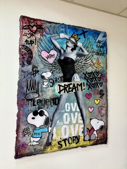 Il mio lavoro è un vibrante tributo alla cultura pop e all’audacia dei sogni. Ho mescolato acrilico, collage e… graffiti, catturando uno spirito libero e audace. Questa figura centrale, con le ali spiegate, incarna l'aspirazione a elevarsi oltre i limiti convenzionali, circondata da icone nostalgiche che evocano ricordi gioiosi. È un pezzo che porta energia e ispirazione, invitando ogni spettatore ad abbracciare il proprio potere di sognare e creare.