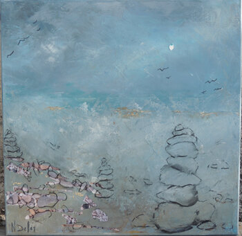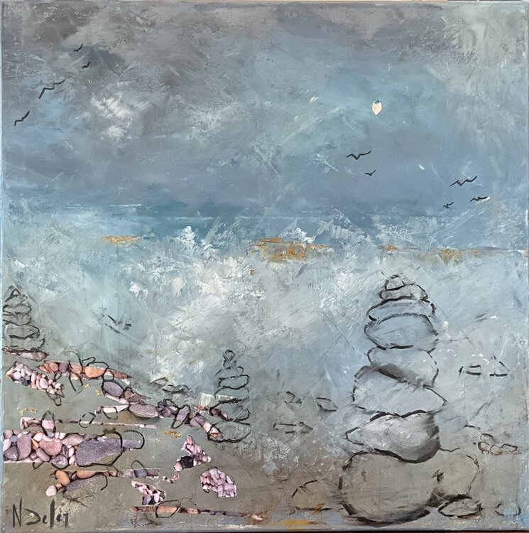 In questo paesaggio, le pietre accatastate sembrano cercare una fragile stabilità di fronte all'immensità dell'acqua e dell'aria.