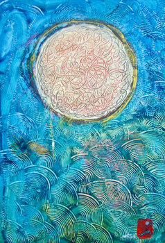 In questo pezzo acrilico, ho infuso il vigore dinamico dell'arte orientale con l'essenza cruda del primitivismo. Il mare vorticoso, preso in preda a una tempesta, danza attorno a un corpo celeste sereno. Ogni pennellata pulsa del potere dello spirito selvaggio della natura. È un pezzo che trasporta l'energia della trasformazione e della resilienza, perfetto per ravvivare qualsiasi spazio con la sua passione sfrenata e la sua aura mistica.