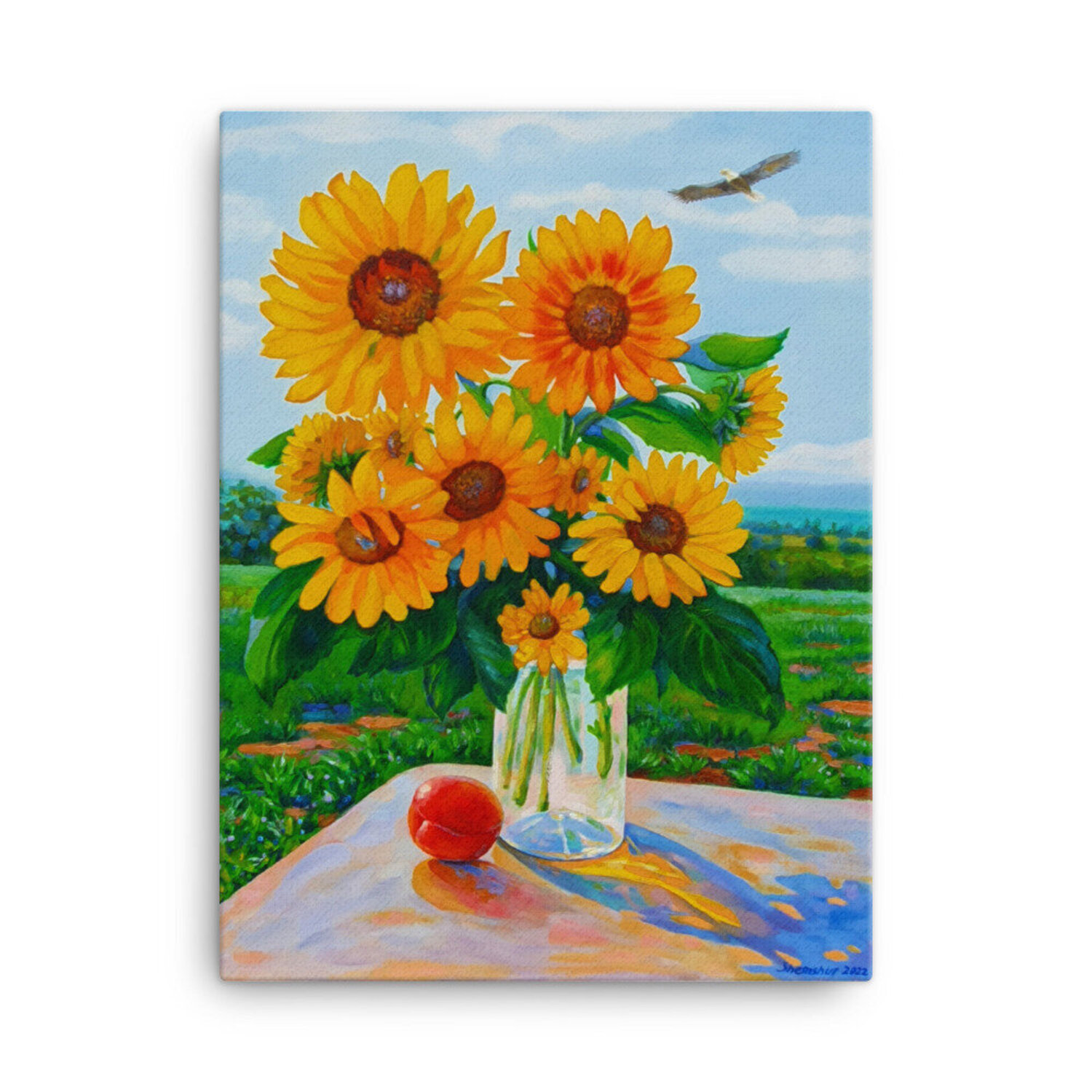 In questo dipinto a olio, ho unito l'essenza vibrante della natura con la profondità delle belle arti, puntando a un dialogo tra le pennellate espressive dell'impressionismo e la chiarezza del realismo. I vivaci girasoli, carichi di vita, trasudano calore e gioia, dominando la tela con la loro presenza baciata dal sole. Una sottile danza di luce e colore celebra la pacifica coesistenza della flora e dei cieli aperti. Questo pezzo cattura un momento… senza tempo, offrendo un'esplosione duratura di vita ed energia per qualsiasi spazio.