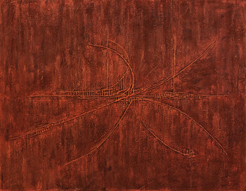 Acrilico su tela - Formato 90x70 - è una firma, un segno lasciato nella memoria di tutti. Quest'opera è illuminata dal suo rilievo e lascia che l'immaginazione si proietti attraverso le sue linee di vita. Un rosso ferro cinese imperiale, potente simbolo di felicità e fortuna. L'intera serie "Empreinte" è realizzata con Modeling Paste Artist su una tela tesa su un telaio ricoperto di chamotte per favorire l'integrazione del rilievo - pittura acrilica… e finiture ad olio portano poi le ombre e le luci a queste opere monocromatiche.