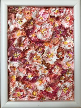 L'opera d'arte è un dipinto originale, unico nel suo genere, dalla texture pesante, creato con la tecnica dell'impasto usando una spatola e vernice acrilica. Dimensioni: 5 x 7 pollici, tela. L'opera d'arte è incorniciata in una cornice bianca. Dimensioni della cornice: larghezza 7,75, altezza 5,75, profondità 1,25. Scomparsa. Pronta per essere appesa a una parete o esposta su una scrivania/mensola.